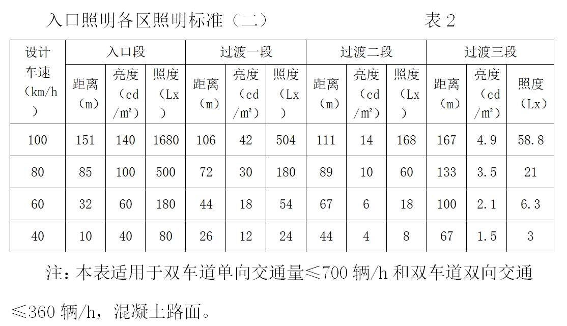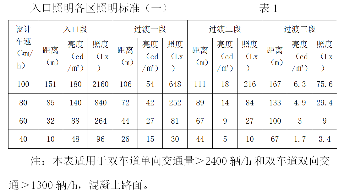 如果是大于100m的隧道,在接近隧道時(shí)可以看到隧道的出口,這樣就出現(xiàn)了黑框現(xiàn)象。為了避免這種現(xiàn)象對(duì)行車的影響,設(shè)置照明時(shí)應(yīng)采取比表1、表2更高的亮度標(biāo)準(zhǔn)。
